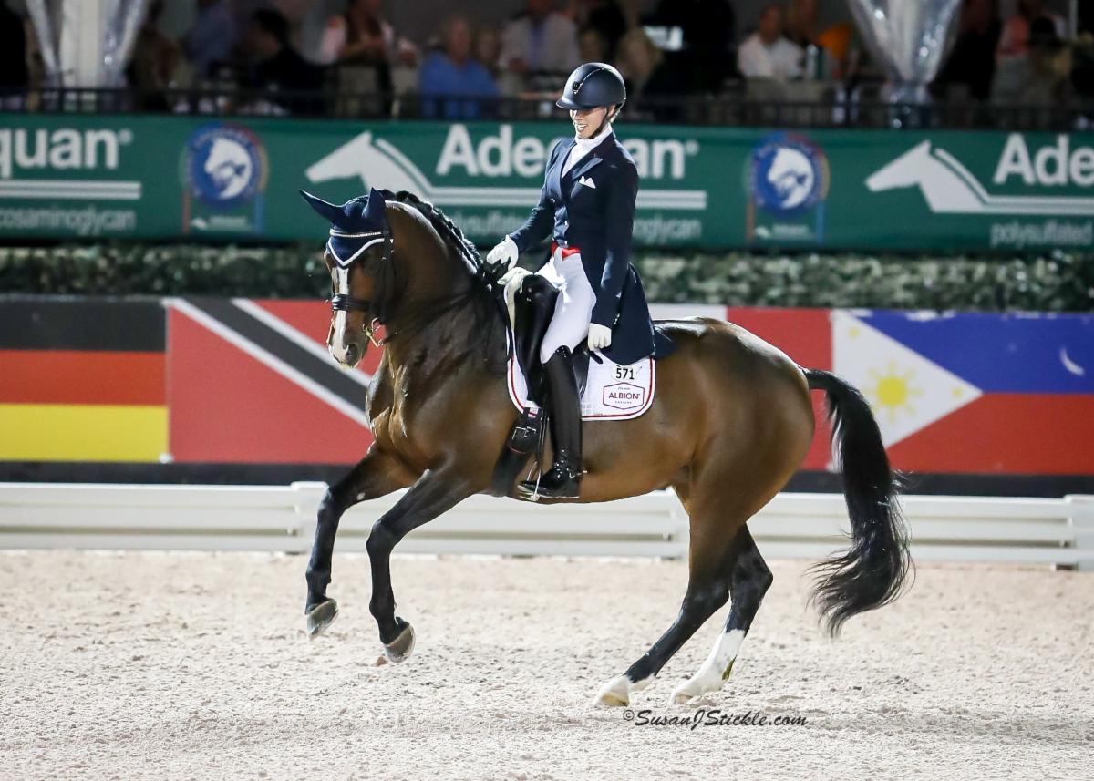 Ottawa, ON – Megan Lane of Loretto, ON and Tina Irwin of Stouffville, ON both earned Individual Gold Medals in the 2017 CDIO 3* Stillpoint Farm FEI Nations Cup on March 24 in Wellington, FL. After the Canadian Dressage Team earned the Gold Medal in the Nations Cup on March 23, the team members, consisting of Irwin and Lane, along with Jaimey Irwin of Stouffville, ON and Jill Irving of Moncton, NB went forward to perform their Freestyles for individual honours. Lane and Caravella (Contango x Riverman) a 16-year-old Dutch Warmblood mare she co-owns with her mother, Cathy, and sister, Kelsey earned Individual Gold after scoring 74.550% in the CDIO 3* FEI Grand Prix Freestyle, which was the highlight of the competition, taking place at night under the lights for an enthusiastic crowd of spectators. “Although we are competing at the top level, there is always so much to work on and she is a special horse to be sharing these exciting experiences with,” said Lane of Caravella, her long-time partner who has been with her from the Junior and Young Rider level all the way up to the Rio 2016 Olympic Games. “I am feeling more confident with Caravella with each month that goes by. I hope our story inspires more riders to pursue dressage." Reflecting on her Nations Cup experience overall, Lane said, “I was so fortunate to be part of such a strong team this year. The success of this week’s Nations Cup would not have been possible for me without the support of Deer Ridge and my sponsors, Albion Saddlery and Omega Alpha Equine.” Tina Irwin’s Individual Gold Medal came in the CDIO 3* FEI Intermediate I Freestyle aboard Laurencio (Laurentio x Donerhall), a 10-year-old Oldenburg gelding she co-owns with her husband, Jaimey Irwin. The duo scored an impressive 76.500% for the win, which secured their hat trick for the week, having also topped the CDIO 3* FEI Prix. St Georges and CDIO 3* FEI Intermediate I earlier in the week to lead Canada to the Team Gold Medal. “I feel quite amazed with what Laurencio and I have accomplished this past season,” explained Tina, who has had an idyllic season in Wellington, highlighted by earning the world’s highest small tour score on record for 2017 (78.708%) during week seven. “I am very excited for the future with this horse. He truly is a star and has all of the qualities that you need in a top competition horse.” Jaimey Irwin also landed on the individual podium, securing the Silver Medal with 73.575% in the CDIO 3* FEI Intermediate I Freestyle, partnered with Donnegal V (Johnson x Gribaldi), a nine-year-old Dutch Warmblood gelding owned by Team Irwin Supporters Group. The podium was rounded out in the CDIO 3* FEI Intermediate I Freestyle by Esther Mortimer of Guatamala, who took the Individual Bronze Medal aboard Adajio. In the CDIO 3* FEI Grand Prix Freestyle, Shelley Francis of the United States earned the Individual Silver with Doktor. Fellow American, Lisa Wilcox was the Bronze medalist with Galant. Irving placed just off the podium, taking fourth (72.875%) in the CDIO 3* FEI Grand Prix Freestyle with Degas 12 (De Niro x Regazzoni), a 15-year-old Hanoverian gelding she owns with Windhaven Farm. For full results and further information, visit http://gdf.coth.com.